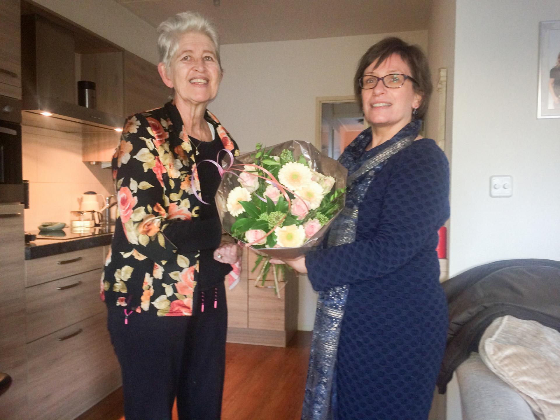 Marijke de Jongste, regiocoördinator van ZOA (rechts op de foto), bedankte Evie onlangs met een mooie bos bloemen voor haar jarenlange betrokkenheid. ‘Ik vind het bijzonder dat zij zich al zo lang inzet voor ZOA. Het treft me dat ze er hart voor heeft en er echt voor gaat.’ aldus Marijke.