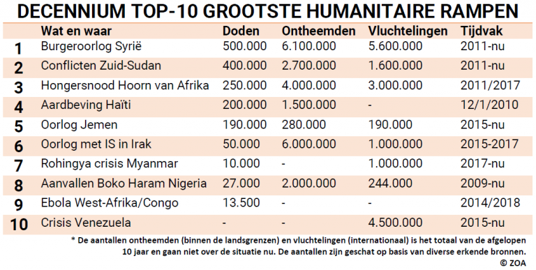 Met de lijst van het afgelopen decennium verstomt deze vraag. In de top 10 over de afgelopen tien jaar staat de enige natuurramp op plaats 4: de aardbeving van 2010 in Haïti. Met 200.000 doden en 1,5 miljoen daklozen een verschrikkelijke ramp. Maar het is een uitzondering in de lijst die verder wordt beheerst door rampen die door mensen zijn veroorzaakt – of voorkomen hadden kunnen worden. Alleen al de man-made crisis in Syrië maakte meer dan twee keer zoveel dodelijke slachtoffers als de tsunami. Anders dan natuurrampen voltrekken deze menselijke crises zich in slow motion en zie je de werkelijke impact pas bij een lijst met de totalen van tien jaar. Een natuurramp is mediageniek, maar een langslepend conflict verliest de aandacht van de media. Als de camera’s weg zijn gaat het lijden echter onverminderd door.
