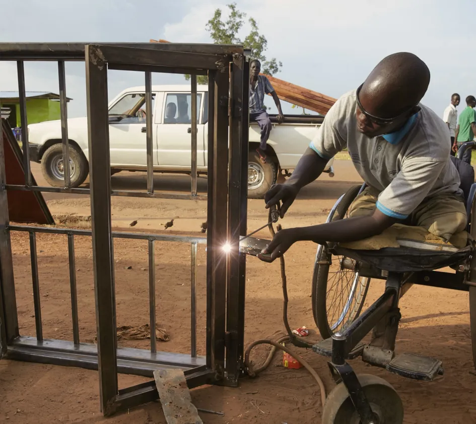 Anaka Oskar Okello uit Uganda mist twee benen maar heeft een bloeiend lasbedrijf.